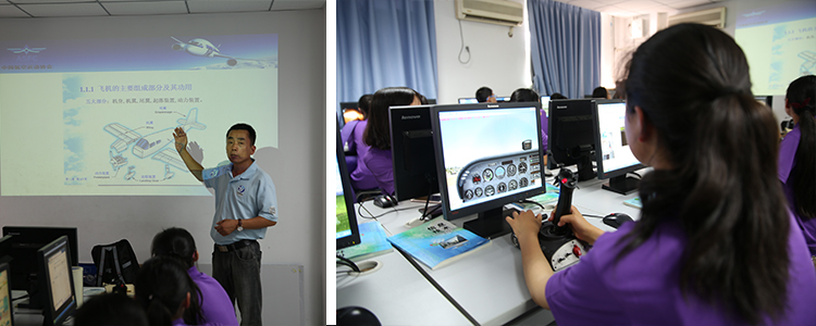 模拟飞行授课(左) 模拟飞行上机体验(右)