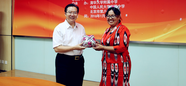 王殿军校长(左)接受新疆麦盖提县骨干教师哈尼克孜·麦麦提赠送纪念品