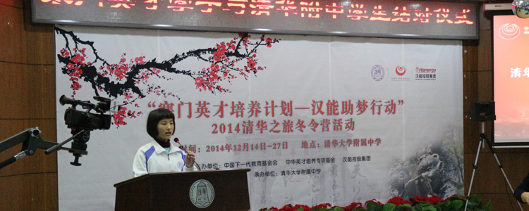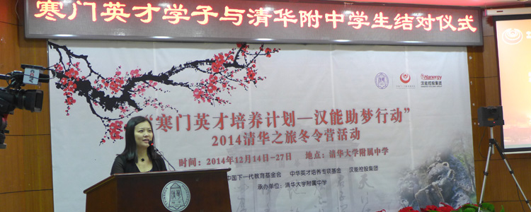 12月14日,bg真人娱乐中华英才培养基金“寒门英才培养计划—汉能助梦行动”暨2014清华之旅冬令营结对仪式在bg真人娱乐举办。来自云南、陕西、甘肃、宁夏、贵州、四川等120名寒门英才班学员及bg真人娱乐、上地学校、永丰学校的120名学生及家长300人参加。