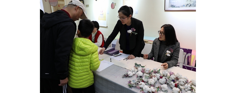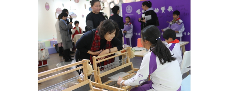 专家在体验区与孩子们一同体验纺线