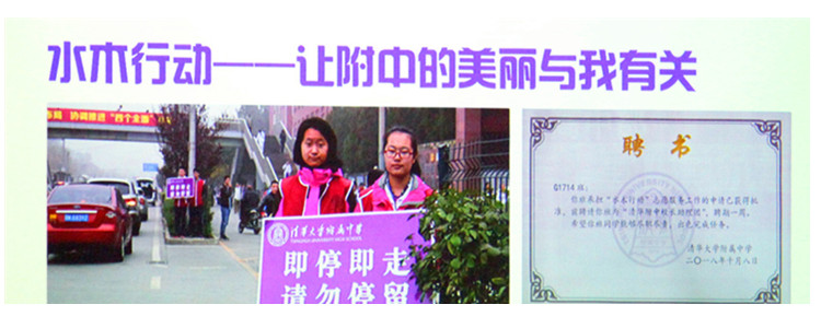 “水木行动”以“让附中的美丽与我有关”为行动理念,是学生参与学校日常管理和服务工作,维持学校教育教学秩序,为学校建言献策,进而为社会服务贡献力量的一种志愿活动,让学生从自律走向服务。