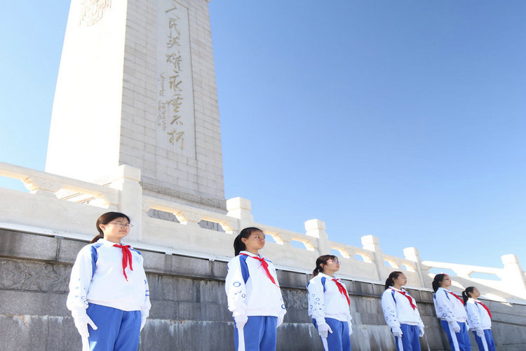 站岗结束后,十二名少先队员列队站在英雄纪念碑下的八幅浮雕前,由队员们自己讲述每一幅浮雕刻画的历史事件,带领大家重温峥嵘岁月,缅怀革命先烈。队员们的讲解生动再现了革命英烈视死如归、大义凛然、为维护祖国和平奋不顾身的精神,声情并茂地刻画了他们为实现今日的太平中国而饱受的苦难。