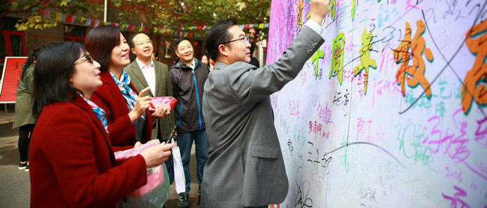 校长在校庆签名板上签名留念