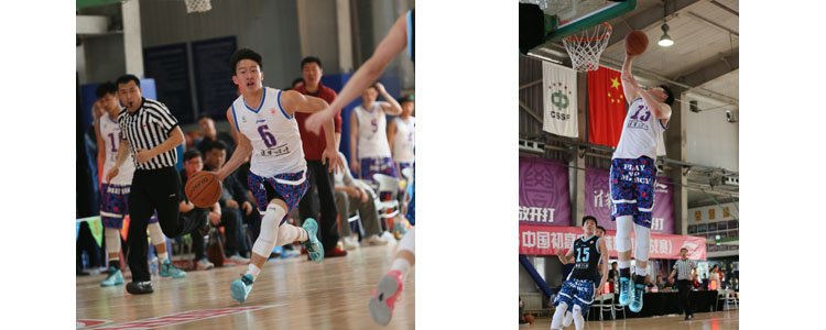 bg真人娱乐6号队员马振宇比赛瞬间(左图) bg真人娱乐13号队员赵柏清在比赛中上演劲爆扣篮(右图)