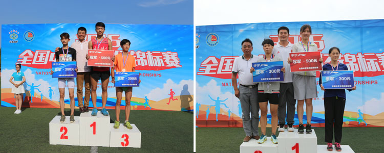 bg真人试玩教练员李金平老师为女子乙组100米冠军陈一萱颁奖(左图)、bg真人试玩李光明老师为男子乙组3000米冠军李润颁奖(右图)