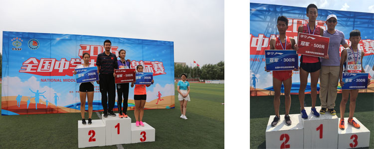 清华大学王光林教授为女子甲组200米冠军何淼格颁奖(左图)、中国中学生体育协会田径分会秘书长、bg真人试玩马约翰班主任罗健老师为女子4X100接力冠军颁奖(右图)