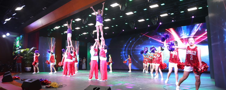 马班毕业生代表宋扬 、孟萱及马班在校学生在节目《奔跑的紫荆花》中表演激情啦啦操