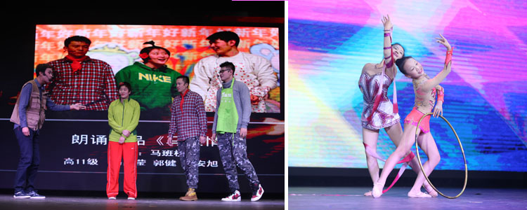 马班毕业生 王安旭、马嘉莹、李杨、郭健表演朗诵&小品《马班情》(左) bg真人试玩舞蹈团学生任开颜、杨乐逸表演艺术体操(右)