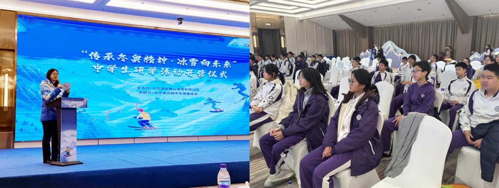 师生们到达延庆冬奥村后,首先参加了“传承冬奥精神·冰雪向未来”开营仪式。北京国家高山滑雪有限公司的相关负责人围绕“冰雪+”产业创新、冬奥场馆的可持续利用等话题,分享了园区的运营经验与未来规划,激起了同学们对冬奥村冰雪运动的强烈好奇。