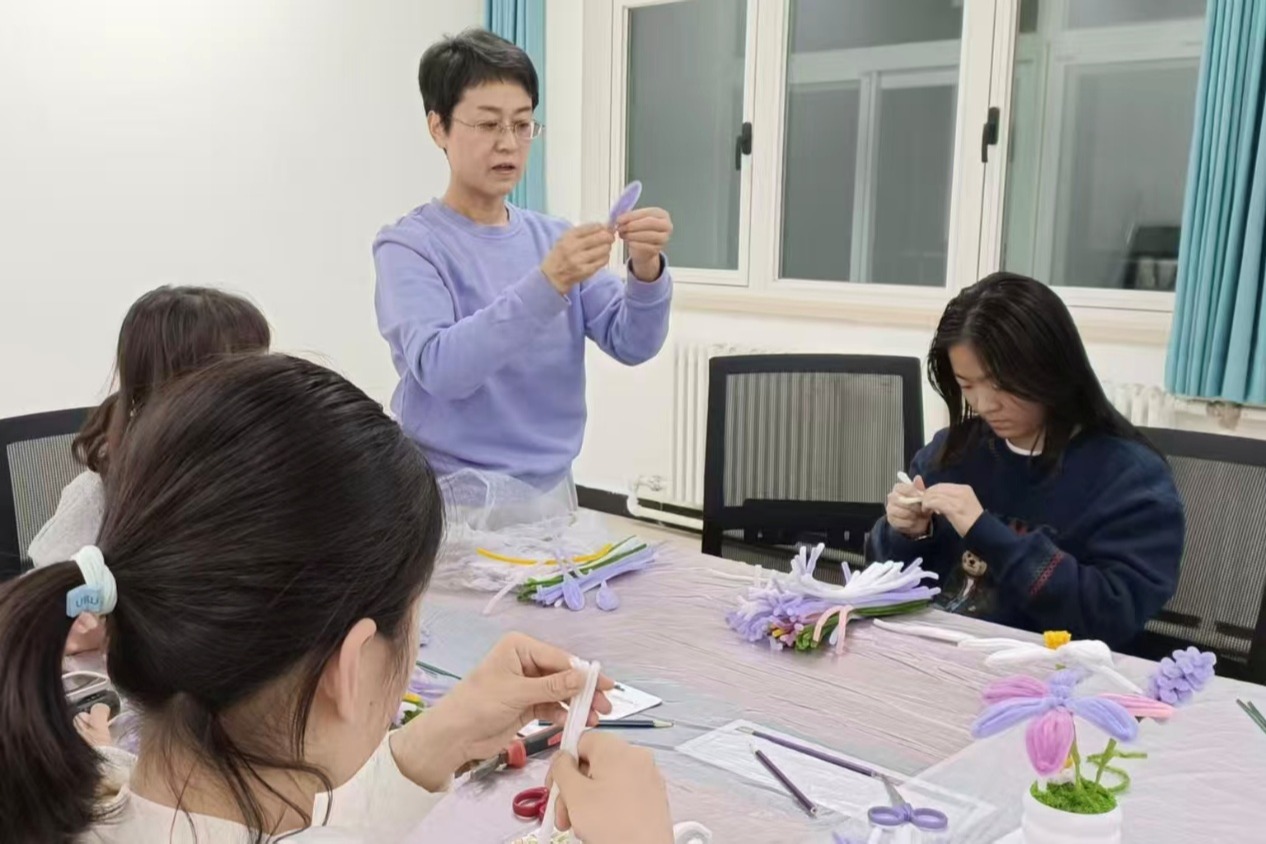 活动伊始,两位老师细致讲解了扭棒造花的基础技法,从扭棒的选材、花瓣的弯折塑形,到花枝的拼接组合、花盆搭配,一步步耐心示范。同学们围坐在一起,专注地拿起扭棒,通过缠绕、弯折、拼接等简单手法,将普通的扭棒逐渐变成色彩斑斓、形态各异的手工花卉。