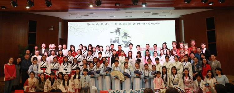 bg真人娱乐西园诗社演出师生合影留念(后排左一:俞佳敏,后排右一:周小玲)