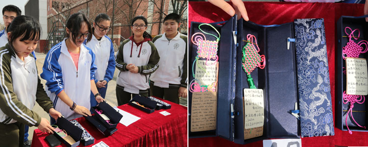 清祈公益社的同学们布置义卖现场(左) 精美的爱心义卖品(纯手工中国结+社员手写祝福卡)(右)