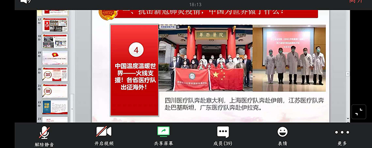 本次主题团日围绕学习中国在全球抗疫中作出的贡献和习近平总书记给援鄂医疗队“90后”党员的回信两部分展开。