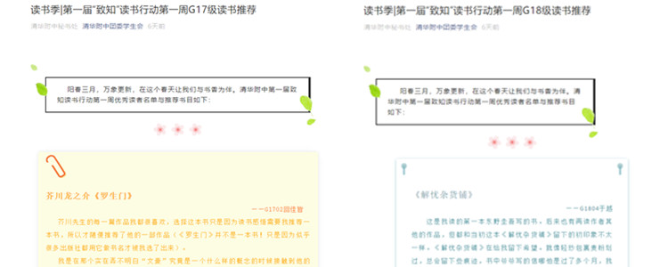 高一高二共28个班级参与了第一届“致知”读书行动。在第一阶段的活动中,依据图书馆借阅排行榜,选出了19名班级优秀读者。优秀读者热心分享了自己的阅读心得并将自己最感兴趣的书目分享给了同学们。书目推荐一经发布便引发了同学们的热烈讨论,同时也拉开了第二阶段活动的序幕。