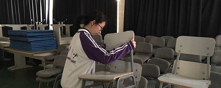 同学们以小组为单位分别开展了接待大厅、报告厅、图书馆、实验楼多功能厅等公共场所的卫生清扫工作以及操场定位点喷漆、校门口交通疏导、摆放自行车等志愿服务活动。
