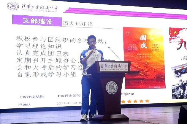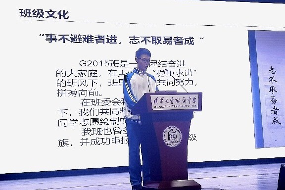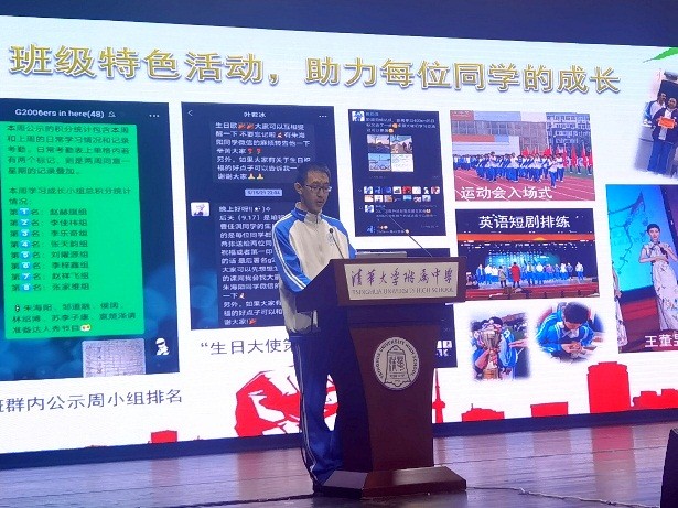 随后,初2014班和初2106班的同学代表分别从不同的视角介绍了各自班级的班集体建设情况。来自初2014班李思睿和陈碧天两位同学,分别从班级日常管理、星级班级申请、水木行动计划以及班级特色活动,如幸福成长小组、亲子跑团、爱心义卖、做春饼、模拟人大代表提案等方面进行了细致的分享;来自初2106班的郑凯瑞、郝煜、吴际如、林灏琪和马羽辰5位同学分别从班级文化建设、特色活动、纪律卫生自治、活动参与和公益活动等方面进行了展示,体现了初2106班强大的班级凝聚力和向心力,为在场同学呈现了一个很好的班级管理范例。