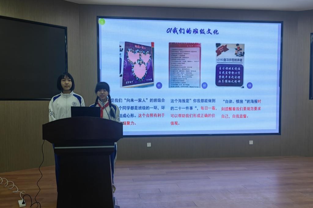 随后,初2102班和初2109班的代表分享了班级建设经验。初2102班主要从班级文化、行为规范、班级管理、慎独自律、特色和活动五个部分来介绍。作为艺术班,他们完美的发挥了自己在艺术方面的特长,积极投身到学校的艺术活动中,悠扬的音符飘扬在梧桐树下;优美的画卷点缀于附中校园里。此外,二班同学在向东佳老师的带领下积极开展小组活动和班级特色活动,班集体的每一位班干部倾力奉献、不计回报,打造了团结一心的“弦外丹青”。初2109班的同学从班名“乐学”的角度出发,详细讲解了如何建设有特色的班集体。有特色的班集体需要每位班干部别出心裁,强调要“专人专项专职;自律自觉自治”。在班主任潘老师的带领下,他们不断突破创新,吸取新鲜力量,争做优秀集体。