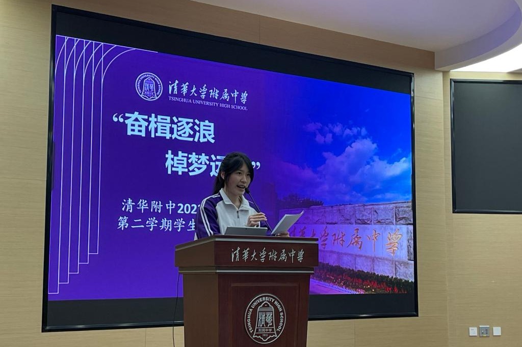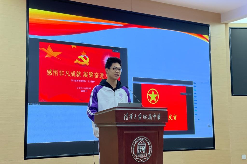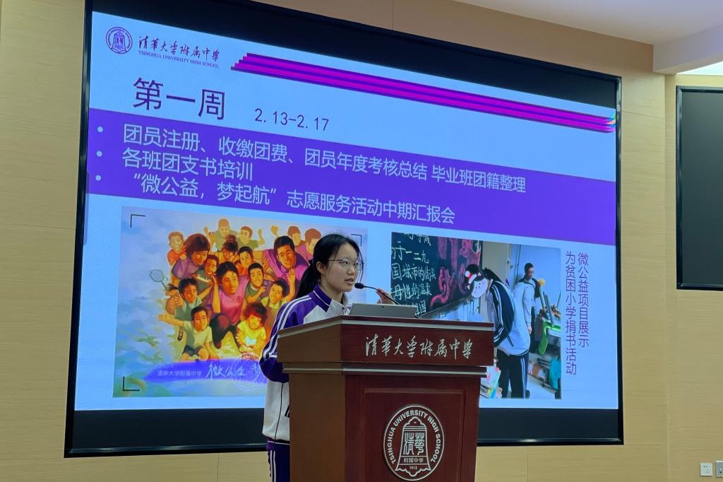 高中会场由学生会主席尹丝缘同学主持,团委书记任星阳老师首先进行了题为“‘清’春年华蓄势起,挺膺担当再出发”的讲话,带领同学们回顾校园文化,唤醒属于附中人的责任,并鼓励帮助同学们尽快回归校园生活。接下来团委副书记肖聿琳同学为大家介绍了本学期的学生活动安排。接着,高二年级17个班的班长进行述职,各班班长介绍了上学期在班级文化建设、思想政治教育、校园活动参与、学生个性发展等方面取得的成绩。在场的所有同学根据评分表进行打分。