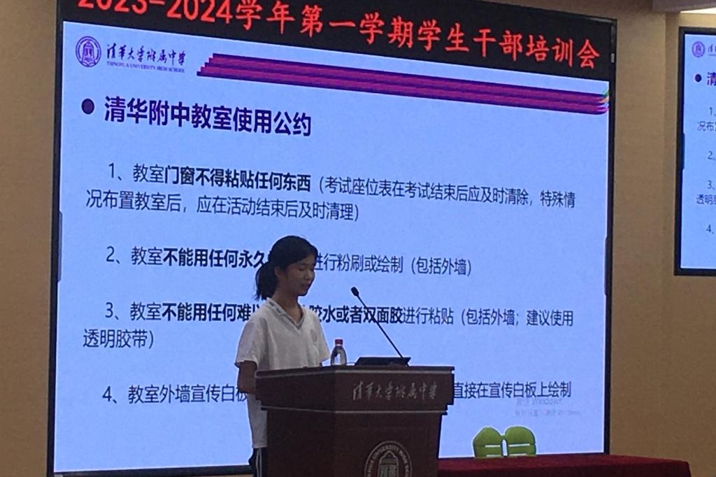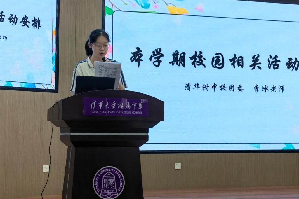 初中会场由初中学生会主席初2104班姚铭禹和副主席初2109班姚懿祯同学主持。首先,学生发展中心刘志杰老师就初中德育规章制度向初一新生介绍,包括附中的值周工作制度、晨检规章制度、课间操规章制度以及具有附中特色的水木行动,强调附中学生应遵守校纪校规,展现责任与担当。