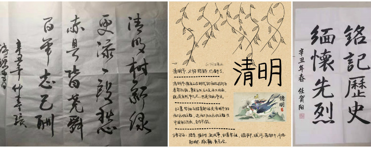 主题教育活动包括开展“穿越时空的对话”——写给革命先烈的一封信征集活动。倡导同学们用写书信的方式,打开历史节点,了解革命先烈的生平,学习伟大精神,缅怀光辉事迹,表达青少年学生弘扬革命传统、争做社会主义建设者和接班人的决心。同学们结合“学党史、强信念、跟党走”系列学习教育活动进行“我绘英烈”作品创作;在“清明祭奠英烈”专题网页参与“云祭扫”活动,歌颂英雄,怀念英雄;查阅与清明节有关的古诗词,通过给古诗配图、配乐、诵读等形式,踏青怀古,诗诵忠魂,带领同学们感悟诗词中蕴含的古代先贤的精神力量;围绕“清明祭英烈”主题召开班会,了解清明节的知识,介绍革命先烈的英勇事迹,增强文化自信,培育家国情怀。