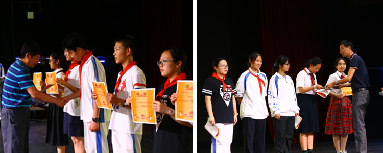 伴随着庄严的国歌声,离队建团仪式正式开始。首先,学生发展中心副主任王田致辞,他对即将步入青春的同学们提出三点希望,希望他们不忘童心,保留一份纯真,相信人性的美好;希望他们在思想上积极向团组织靠拢,对自己高标准严要求;希望他们拥有感恩的心,争取让世界变得更美好。随后,白雪峰副校长宣读《bg真人试玩初15级“六一”表彰决定》,根据表彰决定授予初1507中队、初1511、初1502、初1509、初1508、初1503、初1505七个中队“优秀中队”荣誉称号,授予百余名学生“优秀中队干部”、“优秀少先队员”、“单项标兵”等个人荣誉称号。白雪峰、王田为获奖集体和个人代表颁奖。