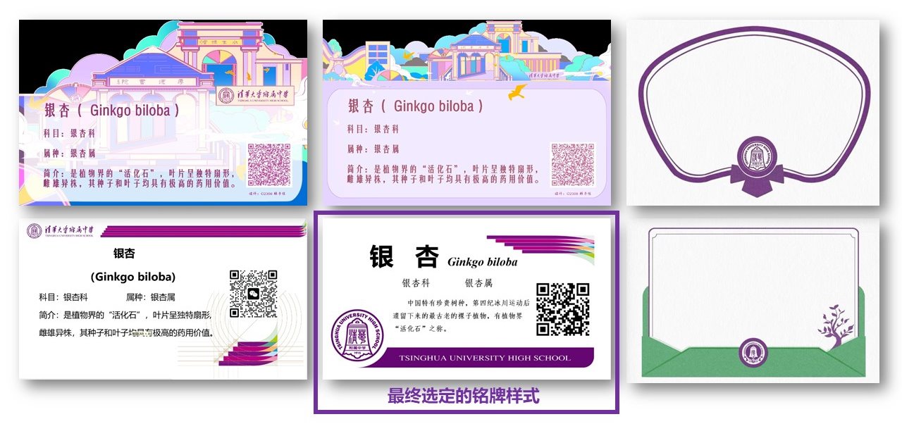 新款铭牌的植物特征介绍采用线上线下结合的方式。印刷在牌上的简介力求体现附中的文化特色,而专业化的植物特征介绍则设置在小程序网页上。每块铭牌均配备专属二维码,扫码即可进入由网络中心段晨老师团队开发的“附中植物图鉴”小程序。线上线下联动的设计,既满足亲子家庭日的趣味互动需求,也为师生提供研究性学习素材。