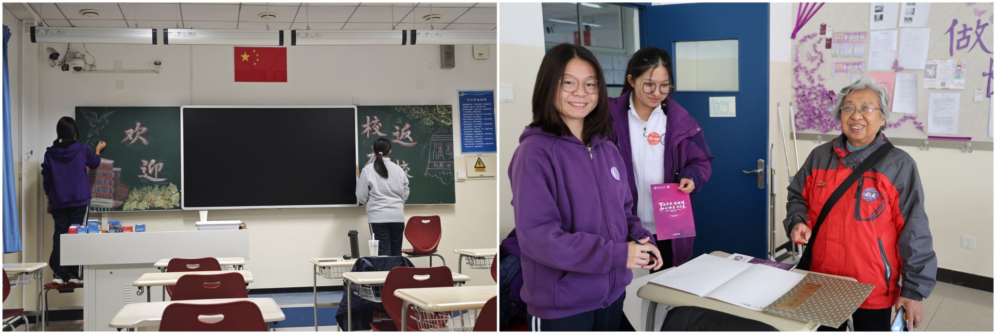 学生志愿者布置教室欢迎校友“回家”、服务“回家”校友