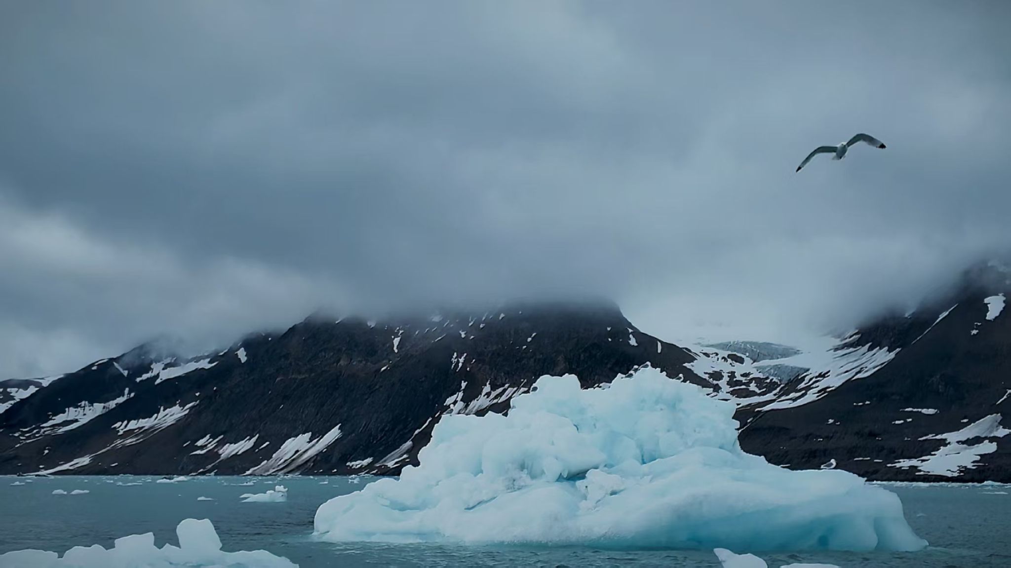 斯匹次卑尔根西北角的“冒险见证地”,散落着19世纪瑞典北极探险的遗迹,极端环境中不灭的是人类探索的勇气。岛上隆起的小冰山如同大地的呼吸起伏,与天空中的雾气交相呼应,模糊了天地界限,创造出一种“恍惚之境”。孤独翱翔的海鸥划过天空书写着自由的宣言,与下方静止的冰山形成动与静的时空永恒。